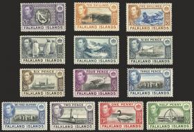249 MALVINAS (FALKLAND I.) - EMISIONES GENERALES Serie / Nuevo o Nuevo Mint N°Cat.: Yv.78/89 Valor de catál.: Euros 400 MB. Yvert 78/89, 1937/41 Animales, barcos, etc., serie completa de 13 valores nuevos o nuevos mint, excelente calidad! Precio inicial: US$ 150 Precio actual: US$ 150 Oferte US$ 150 o más | |