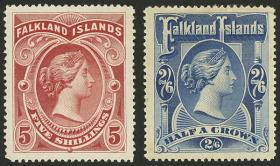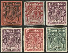 248 MALVINAS (FALKLAND I.) - EMISIONES GENERALES Serie / Nuevo con bisagra N°Cat.: Yv.32/36 Valor de catál.: Euros 1.395 MB. Yvert 32/36 (Sc.36/40), 1912/4 Jorge V, los valores altos de la serie (del 5s. castaño lila incluímos 2 tonos), suaves marquitas de bisagra, muy frescos, excelente calidad, valor de catálogo Yvert Euros 1.395 Precio inicial: US$ 550 Precio actual: US$ 550 Oferte US$ 550 o más | |