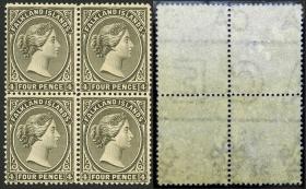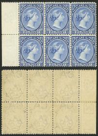 246 MALVINAS (FALKLAND I.) - EMISIONES GENERALES Multiplo / Nuevo o Nuevo Mint N°Cat.: Sc.15c MB. Sc.15c, 1901 Victoria 2½p. ultramar oscuro, magnífico bloque de 6 con borde de hoja (posiciones 1/13 - 21/23), 4 sellos nuevos mint y 2 con suave marca de biagra, lujo! Precio inicial: US$ 200 Precio actual: US$ 200 Oferte US$ 200 o más | |