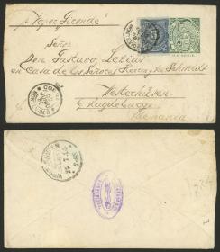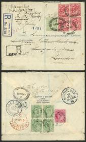 218 INDIA INGLESA - HISTORIA POSTAL Sobre / N°Cat.: MB. FRANQUEO MIXTO, perfins, etc.: Sobre enviado certificado el 2/FEB/1910 desde NELLONE a Ludgate Circus (Inglaterra), franqueado al dorso. El 12/MAR llegó a London y el 18 a su destino, donde lo re-franquearon con sellos ingleses (al frente, con perfins "T C & S") y lo enviaron a Nürnberg (Alemania), muy interesante, MB calidad! Precio inicial: US$ 100 Precio actual: US$ 100 Oferte US$ 100 o más | |