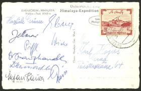 261 PAKISTÁN - HISTORIA POSTAL Sobre / N°Cat.: MB. EXPEDICIÓN AUSTRÍACA AL HIMALAYA: Tarjeta postal con vista del monte Karakorum enviada el 3/MAY/1958 a Graz (Austria) con las firmas de los miembros de la expedición, entre otros: Reiss, Wiche, Mandel, Hammerschlak, Jettmar, y Pauer, excelente calidad! Precio inicial: US$ 100 Precio actual: US$ 100 Oferte US$ 100 o más | |