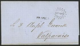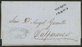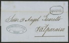 301 PERÚ - HISTORIA POSTAL Sobre / N°Cat.: MB. 23/DIC/1868 Iquique a Valparaíso, carta completa con interesante texto comercial relacionado con la venta de salitre, enviada sin franqueo con marca "IQUIQUE" enmarcada perfectamente aplicada, excelente calidad! Precio inicial: US$ 150 Precio actual: US$ 150 Oferte US$ 150 o más | |