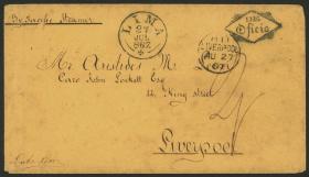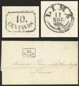 298 PERÚ - HISTORIA POSTAL Sobre / N°Cat.: MB. Sobre enviado el 27/JUL/1867 de Lima a Inglaterra, sin franqueo, con marcas "DE OFICIO", fechador de Lima, y arribo a destino el 27/AGO (todas al frente!), y al dorso tránsito por London en rojo, muy buena calidad, raro! Precio inicial: US$ 300 Precio actual: US$ 300 Oferte US$ 300 o más | |