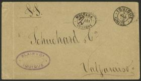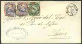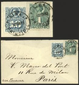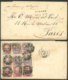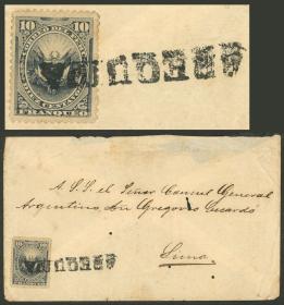 308 PERÚ - HISTORIA POSTAL Sobre / N°Cat.: MB. TRIPLE PORTE: Sobre enviado en NOV/1880 de Chimbote a Francia con franqueo al dorso de 36c. con sellos sobrecargados "PLATA-PERU", tiene tránsito por Panamá el 28/NOV y arribo a Paris el 25/DIC, muy rara, MB calidad, ex-Herbert Moll Precio inicial: US$ 500 Precio actual: US$ 500 Oferte US$ 500 o más | |