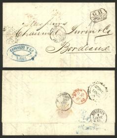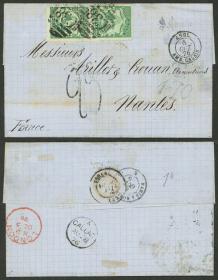 304 PERÚ - HISTORIA POSTAL Sobre / N°Cat.: MB. 27/AGO/1876 Callao a Francia, carta completa franqueada con 10c. (pareja Sc.16), fue entregada directamente al Consulado Británico y allí matasellaron las estampillas peruanas con la marca "C38", tiene varias marcas interesantes al frente y dorso, excelente calidad, ex-Herbert Moll Precio inicial: US$ 300 Precio actual: US$ 300 Oferte US$ 300 o más | |