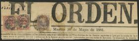309 PERÚ - HISTORIA POSTAL Pieza / N°Cat.: MB. Bonito franqueo en fragmento de periódico fechado en Lima 10/MAY/1881, seguramente enviado al exterior (al parecer se ha caído un sello del franqueo original), rarísimo durante la ocupación chilena, muy decorativo! Precio inicial: US$ 250 Precio actual: US$ 250 Oferte US$ 250 o más | |