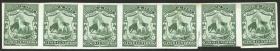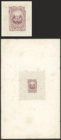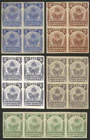 215 HAITÍ - EMISIONES GENERALES Lote / Sin usar (sin goma) N°Cat.: Sc.46/50 MB. Sc.46/50, 1898 1c. a 7c., lote de 4 cuadros + una tira x4 SIN DENTAR, el 1c. con doble impresión total e impreso en papel con filigrana RH, el 2c. también en papel con filigrana RH, el 3c. es una prueba en papel blanco, 5c. y 7c. impresos en papel con filigrana, atractivo conjunto! Precio inicial: US$ 100 Precio actual: US$ 100 Oferte US$ 100 o más | |
