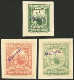 275 PERÚ - EMISIONES GENERALES Lote / Sin usar (sin goma) N°Cat.: Sc.165/167 MB. Sc.165/167, 1905 Instituto Municipal de Higiene 12c. + sobrecargados de 1c. y 2c., los 3 con sobrecargas SPECIMEN aplicadas en el correo de Natal luego de recibirlas como muestras desde la UPU, rarísimas y únicas. NOTA: El correo de Natal adhería en hojas de album los sellos que recibía como muestras desde la UPU y a todos les aplicaba estas sobrecargas manuales, cada estampilla así sobrecargada es única e irrepetible. Precio inicial: US$ 100 Precio actual: US$ 100 Oferte US$ 111 o más | |