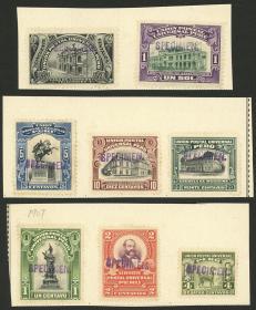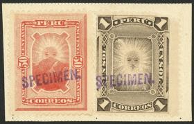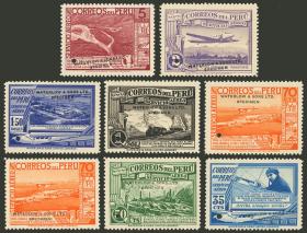 285 PERÚ - CORREO AÉREO Lote / Nuevo con bisagra N°Cat.: Sc.C25+otros MB. MUESTRAS: Sc.C25 + otros, 1936/7 8 valores de la serie impresos en colores distintos a los adoptados, con taladrado y sobrecarga "Waterlow & Sons Ltd. - SPECIMEN", del 70c. incluímos 2 (uno sin taladrar y con la sobrecarga en distinta posición), casi todos nuevos mint excepto 2 que son sin goma, MB calidad, raros! Precio inicial: US$ 100 Precio actual: US$ 100 Oferte US$ 100 o más | |