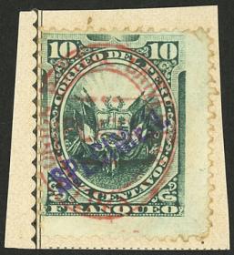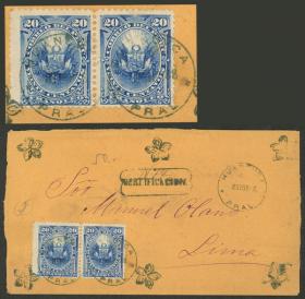 267 PERÚ - EMISIONES GENERALES Pieza / Usado N°Cat.: Sc.77+69 pareja MB. Sc.77, 1883 50c. con doble sobrecarga: "PLATA-PERU" en rojo y triángulo en negro + pareja de 10c. con sobrecarga triángulo, en un fragmento de carta certificada de cuádruple porte enviada desde Trujillo a Lima (40c. de porte + 30c. de certificación), MB calidad, raro! Precio inicial: US$ 200 Precio actual: US$ 500 Oferte US$ 550 o más | |