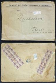 209 GRECIA - HISTORIA POSTAL Sobre / N°Cat.: Aceptable-Buena 31/JUL/1934 Thessaloniki a Alemania, sobre de tamaño grande (34 x 25 cm.) enviado certificado con franqueo al dorso, total 655d formados con 5d + 30x 20d + 50d., todos los sellos con PERFIN "TE", algunos defectitos pero muy interesante! Precio inicial: US$ 100 Precio actual: US$ 100 Oferte US$ 100 o más | |