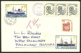 252 MALVINAS (FALKLAND I.) - HISTORIA POSTAL Sobre / N°Cat.: MB. SELLOS USADOS COMO MULTA: Sobre enviado el 9/SEP/1982 desde Indianapolis (USA) a Fox Bay con franqueo de 5c. insuficiente y por ésto tasado, al llegar a destino el 26/OCT le aplicaron sellos por 11p. para pagar la multa, MB calidad! Precio inicial: US$ 50 Precio actual: US$ 50 Oferte US$ 50 o más | |