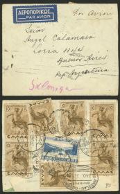204 GRECIA - CORREO AÉREO Sobre / N°Cat.: Yv.40/49 Valor de catál.: Euros 300+ MB. Yvert 40/49, 1940 Organización Nacional de la Juventud Helénica, la serie de 10 valores en un sobre circulado el 4/MAY/1940 (tiene más franqueo al dorso, ver foto), muy buena calidad! Precio inicial: US$ 100 Precio actual: US$ 100 Oferte US$ 100 o más | |