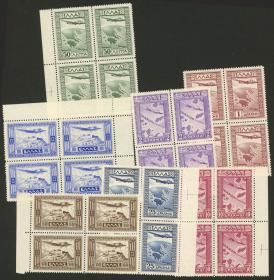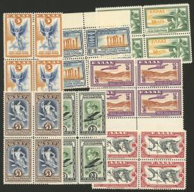205 GRECIA - CORREO AÉREO Lote / Nuevo Mint N°Cat.: Yv.58 var. MB. Yvert 58, 1942/3 50d. ultramar, cuadro sin dentar impreso sobre la goma + pareja sin dentar con impresión muy ténue + cuadro sin dentar con doble impresión (éste sin goma), y también Yert 60 en un cuadro con el DENTADO MUY DESPLAZADO, excelente calidad! Precio inicial: US$ 100 Precio actual: US$ 100 Oferte US$ 100 o más | |