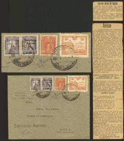 327 PERÚ - HISTORIA POSTAL Error / N°Cat.: MB. 3/ENE/1928 IQUITOS - Lima, Vuelo inaugural, frente de sobre transportado en un hidroavión piloteado por H. Grow entre Iquitos y Masisea, allí se trasladó la correspondencia al avión piloteado por el teniente L. Alvariño que la llevó hasta San Ramón, continuando por carretera hasta La Oroya y desde allí por tren a Lima. El franqueo es el correcto de 12c. + 1P. de sobretasa aérea (pareja de Yvert 1 "Marinerito", tipos 5 + 1), la marca "Servicio Aéreo" siempre se aplicaba en color rojo en los sobres que partían desde Iquitos. Incluímos 2 recortes de periódicos de la época indicando la inauguración del servicio y las tarifas, muy buen conjunto! Precio inicial: US$ 250 Precio actual: US$ 250 Oferte US$ 250 o más | |