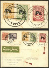 329 PERÚ - HISTORIA POSTAL Sobre / N°Cat.: MB. 22/OCT/1928 Primer vuelo Perú - Ecuador - Colombia, sobre con franqueo de 12c. ordinarios + sobretasa aérea con sellos SCADTA con sobrecarga "PE.", enviado de Paita a Barranquilla (con marca de arribo al dorso el 25/OCT), muy buena calidad! Precio inicial: US$ 300 Precio actual: US$ 300 Oferte US$ 300 o más | |