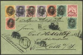 321 PERÚ - HISTORIA POSTAL Sobre / N°Cat.: MB. RARO FRANQUEO DE 18c. para un sobre con impresos, enviado certificado con AR de Lima a Alemania el 4/JUN/1895, al dorso tiene marca de arribo a Halle el 11/JUL. La tarifa de 18c. se componía de 3c. de franqueo ordinario para impresos + 10c. de certificación + 5c. por el aviso de retorno, excelente calidad, ex-Moll Precio inicial: US$ 250 Precio actual: US$ 250 Oferte US$ 250 o más | |