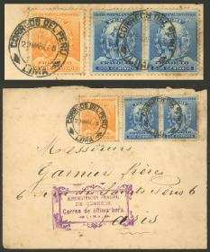 323 PERÚ - HISTORIA POSTAL Sobre / N°Cat.: MB. Sobre enviado el 19/DIC/1898 de Pacasmayo a USA con tarifa de 22c. (doble porte), al dorso tienen tránsito por Paita y arribo a destino + otro sobre con tarifa reducida de papeles de negocio enviado a New York con 4c. (pareja Sc.155), ambos de muy buena calidad! Precio inicial: US$ 100 Precio actual: US$ 100 Oferte US$ 111 o más | |