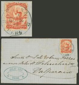 305 PERÚ - HISTORIA POSTAL Sobre / N°Cat.: Buena-MB Sobre enviado en 1877 a Italia con franqueo de 10c. con matasello de TACNA, enviado por correo inglés (tránsito por London el 1/MAR/1877), al llegar a destino en Picerno le aplicaron sellos de tasa italianos por 2,30L., muy atractivo! Precio inicial: US$ 200 Precio actual: US$ 200 Oferte US$ 221 o más | |