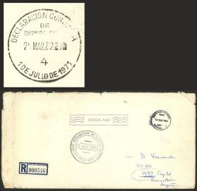 251 MALVINAS (FALKLAND I.) - HISTORIA POSTAL Sobre / N°Cat.: MB. Sobre oficial certificado enviado el 16/MAR/1982 desde South Georgias a Buenos Aires, con marcas de la Declaración Conjunta inglesa y argentina aplicadas el 23/MAR en Port Stanley y el 25/MAR en Buenos Aires, A SOLO UNA SEMANA DEL INICIO DE LA GUERRA, excelente calidad, muy raro! Precio inicial: US$ 200 Precio actual: US$ 200 Oferte US$ 200 o más | |
