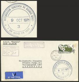 250 MALVINAS (FALKLAND I.) - HISTORIA POSTAL Sobre / N°Cat.: Buena RARA MARCA DE DECLARACIÓN CONJUNTA: Sobre enviado desde Port Stanley a Argentina con franqueo de 6p., al llegar a Buenos Aires el 9/OCT/1971 recibió la escasa marca de Declaración Conjunta "3", al dorso tiene arribo a Gualeguaychú el 11/OCT, buena calidad. Se conocen muy pocos sobres con esta marca con el número 3 aplicadas en el año 1971 (las de años posteriores son comunes). Precio inicial: US$ 150 Precio actual: US$ 150 Oferte US$ 150 o más | |