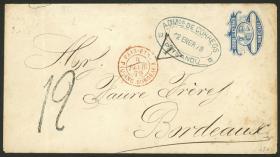 373 URUGUAY - HISTORIA POSTAL Sobre / N°Cat.: MB. Sobre (EP) de 5c. con error ortográfico "CENTECIMOS" + 40c. adicionales al dorso (pareja Sc.38) enviado certificado el 5/ABR/1874 de MERCEDES a Montevideo, excelente calidad, raro, ex-Loeb (su precio de venta: US$3.500) Precio inicial: US$ 2500 Precio actual: US$ 2500 Oferte US$ 2750 o más | |