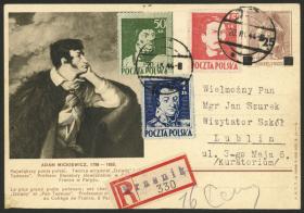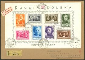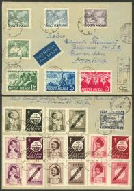 336 POLONIA - EMISIONES GENERALES Sobre / N°Cat.: Yv.544/7 MB. Yvert 544/547, 1948 Serie de 4 valores pro lucha contra la tuberculosis, cuadro o 2 parejas de cada valor, siempre con las viñetas publicitarias adheridas + otra buena cantidad de sellos, franqueando un sobre aéreo certificado enviado el 14/DIC/1949 de Raciborz a Argentina, MB calidad! Precio inicial: US$ 100 Precio actual: US$ 100 Oferte US$ 100 o más | |