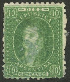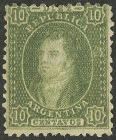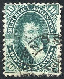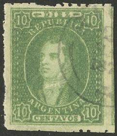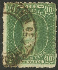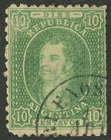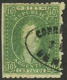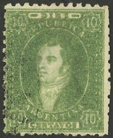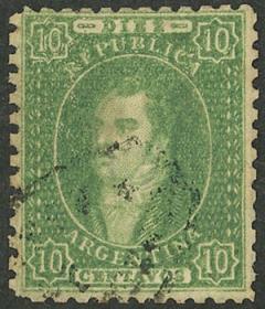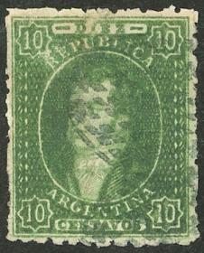 115 ARGENTINA - RIVADAVIAS Sello suelto / Usado N°Cat.: GJ.23 MB. GJ.23, 10c. Impresión semiborrosa, con matasello suave, excelente ejemplar con márgenes tipo JUMBO!! Precio inicial: US$ 25 Precio actual: US$ 25 Oferte US$ 25 o más