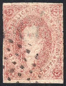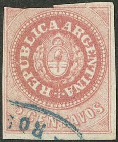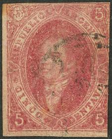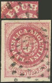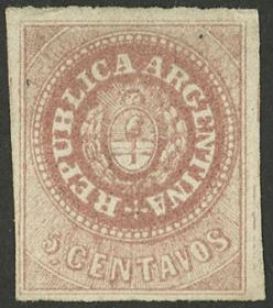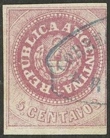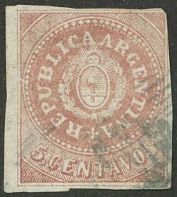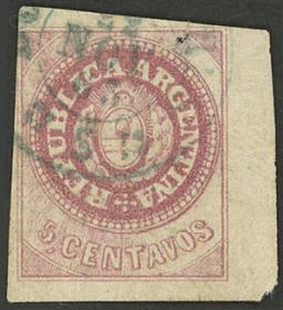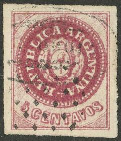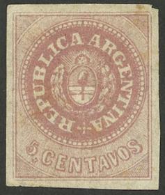 81 ARGENTINA - ESCUDITOS Sello suelto / Usado N°Cat.: GJ.12A Valor de catál.: 44,00 Aceptable GJ.12A, 5c. Sin acento plancha semigastada, ejemplar con borde de hoja, color rosa morado, usado en Bs As en Noviembre 1863, con defectos, buen aspecto! Precio inicial: US$ 10 Precio actual: US$ 10 Oferte US$ 10 o más