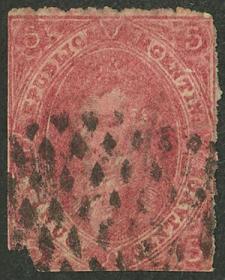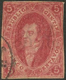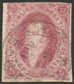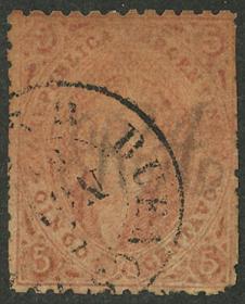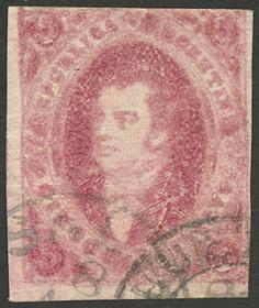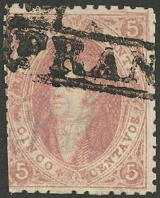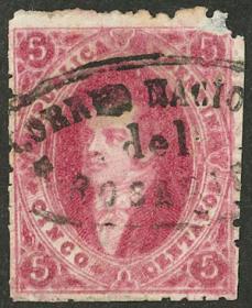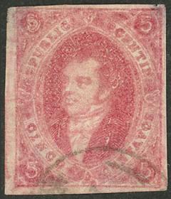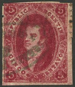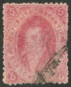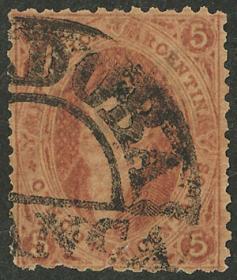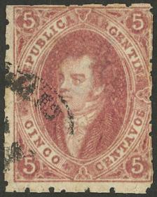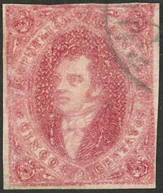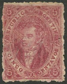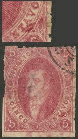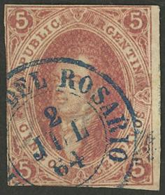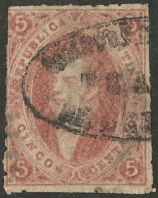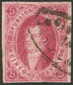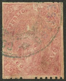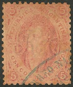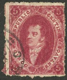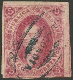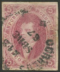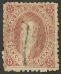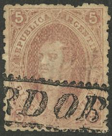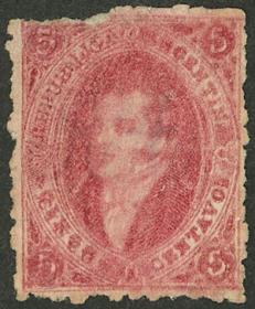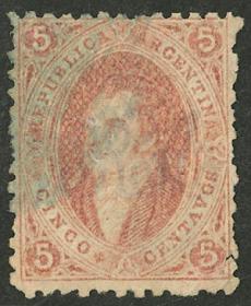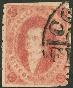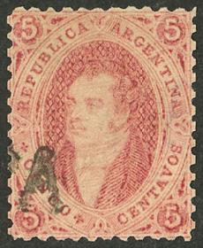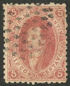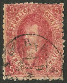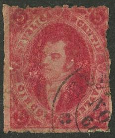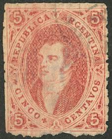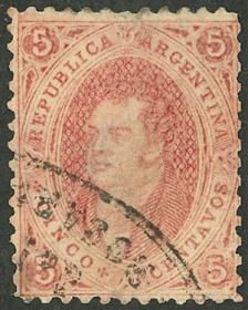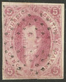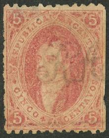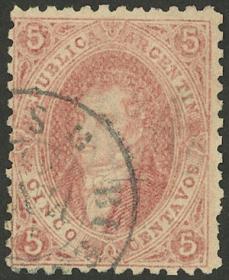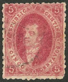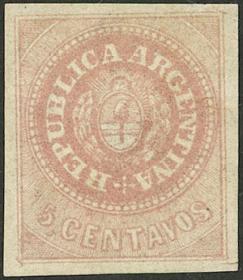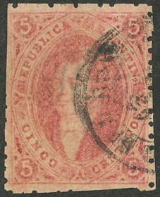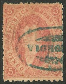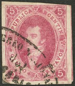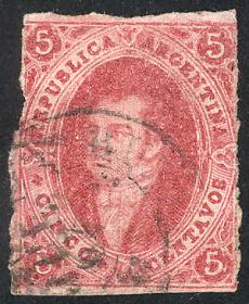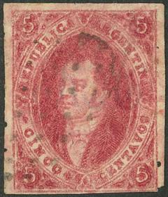 144 ARGENTINA - RIVADAVIAS Sello suelto / Usado N°Cat.: GJ.25A Valor de catál.: 100,00 Buena GJ.25A, 5c 4ª tirada color ROSA VIOLÁCEO, márgenes justos, muy escaso Precio inicial: US$ 25 Precio actual: US$ 25 Oferte US$ 25 o más