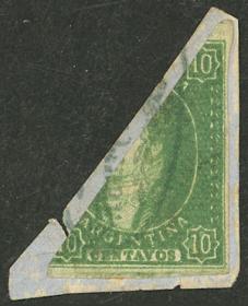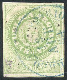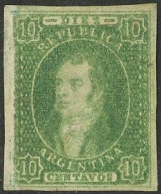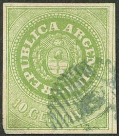 77 ARGENTINA - ESCUDITOS Sello suelto / Usado N°Cat.: GJ.11 Valor de catál.: 250,00 Aceptable-Buena GJ.11, 10c. Sin acento color verde amarillo, usado en Rosario el 19 Abril 1864, ínfimo adelgazamiento del papel al dorso, impactante ejemplar!!! Precio inicial: US$ 120 Precio actual: US$ 120 Oferte US$ 120 o más