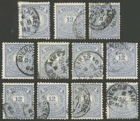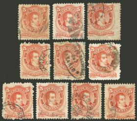 174 ARGENTINA - EMISIONES GENERALES Lote / Usado N°Cat.: GJ.38 x 10 Valor de catál.: 10,00 Buena-MB GJ.38, 10 sellos con variedad de matasellos y colores Precio inicial: US$ 10 Precio actual: US$ 10 Oferte US$ 10 o más