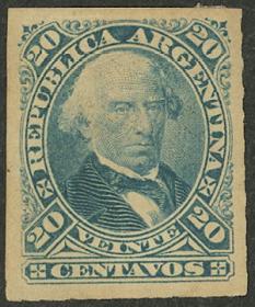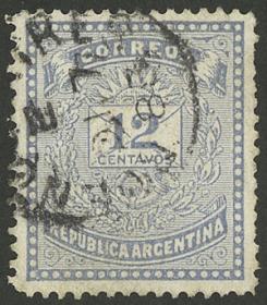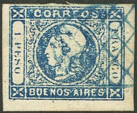 24 ARGENTINA - CABECITAS Sello suelto / Usado N°Cat.: GJ.17 Valor de catál.: 20,00 Buena-MB GJ.17, 1 P. Azul con matasello grilla en color azul, tres amplísimos márgenes!!! Precio inicial: US$ 10 Precio actual: US$ 10 Oferte US$ 10 o más