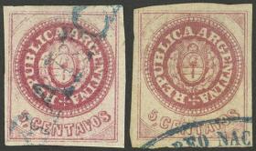 80 ARGENTINA - ESCUDITOS Lote / Usado N°Cat.: GJ.12 Valor de catál.: 66,00 Buena-MB GJ.12, 5c. Sin acento, 2 ejemplares con plancha semigastada en colores rosa carmín + rosa, ambos usados en Rosario, con matasellos: "FRANCA" y Rosario en elipse bicóncava respectivamente, ambos en color azul, MB lote!!! Precio inicial: US$ 35 Precio actual: US$ 35 Oferte US$ 35 o más