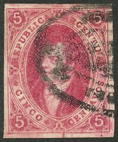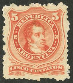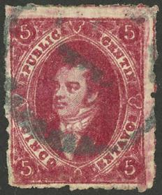 84 ARGENTINA - RIVADAVIAS Sello suelto / Sin usar (sin goma) N°Cat.: GJ.19 Valor de catál.: 72,00 Aceptable-Buena GJ.19, 5c 1ª tirada sin usar, con VARIEDAD : mechón de pelo en la frente, filigrana raya abajo, peladurita al dorso Precio inicial: US$ 25 Precio actual: US$ 25 Oferte US$ 25 o más