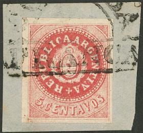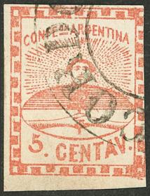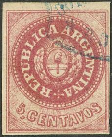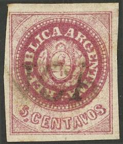 76 ARGENTINA - ESCUDITOS Sello suelto / Usado N°Cat.: GJ.10 Valor de catál.: 22,00 MB. GJ.10, 5c. Sin acento, color rosa rojizo, usado en Rosario, firmado por V. Kneitschel al dorso, excelente!! Precio inicial: US$ 14 Precio actual: US$ 14 Oferte US$ 14 o más