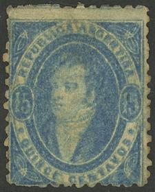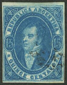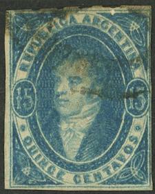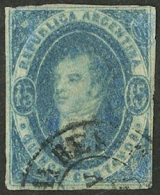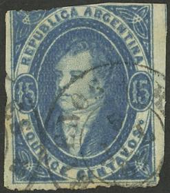 127 ARGENTINA - RIVADAVIAS Sello suelto / Usado N°Cat.: GJ.24 Valor de catál.: 70,00 Aceptable-Buena GJ.24, 15c. Impresión cargada, lindo color azul oscuro, usado en Buenos Aires el 5 de Julio de 1865, un margen justo Precio inicial: US$ 15 Precio actual: US$ 15 Oferte US$ 15 o más