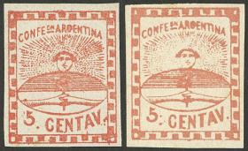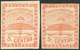 58 ARGENTINA - CONFEDERACIÓN Lote / Nuevo con bisagra N°Cat.: GJ.1d Valor de catál.: 4,00 Buena-MB GJ.1d, 5c. Cifras Chicas, ambos con diferente VARIEDAD : doble punto después de " 5 ", TIPOS VII + IX, MBs Precio inicial: US$ 2 Precio actual: US$ 2 Oferte US$ 2 o más