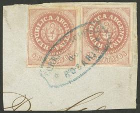 69 ARGENTINA - ESCUDITOS Pieza / Usado N°Cat.: GJ.7 MB. GJ.7, extraordinario fragmento con franqueo de 10c utilizando dos ejemplares de 5c. con acento, con matasello elipse bicóncava de Rosario en color azul, lujo!!!! Precio inicial: US$ 50 Precio actual: US$ 50 Oferte US$ 50 o más