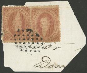 106 ARGENTINA - RIVADAVIAS Pieza / Usado N°Cat.: GJ.20 x 2 MB. GJ.20, 5c 3ª tirada, 2 ejemplares sobre fragmento con matasello puntos de Bs As 7 x 7 completo, gran lujo!!! Precio inicial: US$ 50 Precio actual: US$ 50 Oferte US$ 50 o más