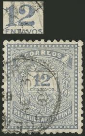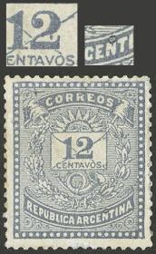 197 ARGENTINA - EMISIONES GENERALES Sello suelto / Sin usar (sin goma) N°Cat.: GJ.65 Valor de catál.: US$ ++60 MB. GJ.65, ejemplar con VARIEDADES : punto de color en " 2 " de 12 + " ARGEÑTIA ", valor del ejemplar tipo US$ 60-, nuevo sin goma, son raras las variedades en el presente sello!!! Precio inicial: US$ 30 Precio actual: US$ 30 Oferte US$ 30 o más