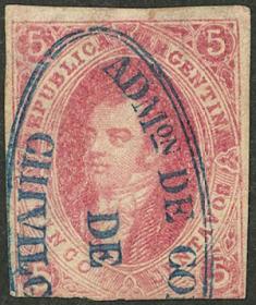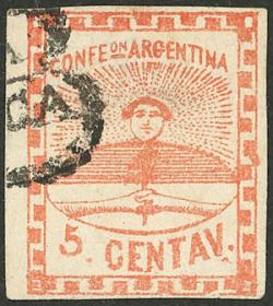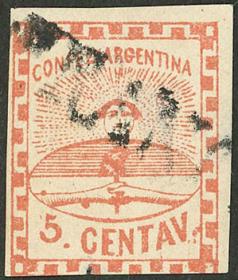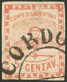 55 ARGENTINA - CONFEDERACIÓN Sello suelto / Usado N°Cat.: GJ.1 Valor de catál.: 40,00 Aceptable-Buena GJ.1, 5c Cifras Chicas, con matasello de Córdoba en semicírculo con FRANCA, peladuras al dorso, buen frente, con sello de garantía de Gillmayr Precio inicial: US$ 9 Precio actual: US$ 9 Oferte US$ 9 o más