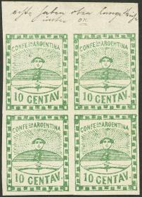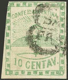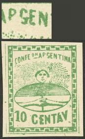 65 ARGENTINA - CONFEDERACIÓN Sello suelto / Nuevo Mint N°Cat.: GJ.5b Valor de catál.: 12+50% MB-Lujo GJ.5b, 10c Cifras Grandes, con VARIEDAD : " APGENTINA " Precio inicial: US$ 9 Precio actual: US$ 9 Oferte US$ 9 o más