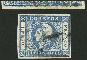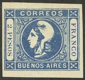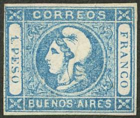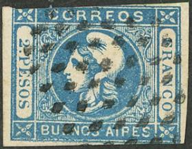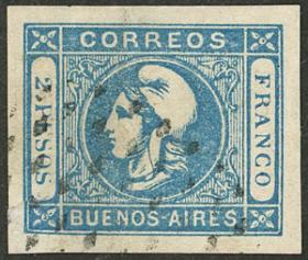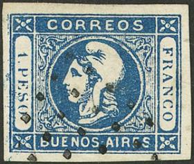 19 ARGENTINA - CABECITAS Sello suelto / Usado N°Cat.: GJ.14 Valor de catál.: US$ +44 MB. GJ.14, 1P. Azul impresión nítida, con matasello puntos 6 x 6 de Bs As, con atractiva VARIEDAD : " PE$O ", MB calidad!! Precio inicial: US$ 35 Precio actual: US$ 35 Oferte US$ 35 o más