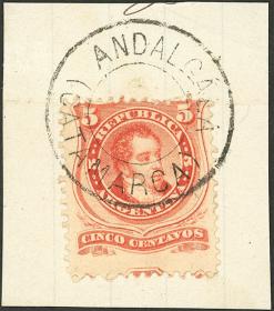 172 ARGENTINA - EMISIONES GENERALES Pieza / Usado N°Cat.: GJ.38 MB. GJ.38, sobre fragmento, con matasello " ANDALGALA " ( Catamarca ), MB!! Precio inicial: US$ 15 Precio actual: US$ 15 Oferte US$ 15 o más