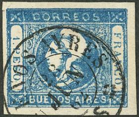 25 ARGENTINA - CABECITAS Sello suelto / Usado N°Cat.: GJ.17 Valor de catál.: 20,00 Aceptable-Buena GJ.17, 1 P. Azul, con matasello fechador de Bs As con " S " del 28 de Junio 1862, peladurita al dorso, frente de lujo! Precio inicial: US$ 10 Precio actual: US$ 10 Oferte US$ 10 o más