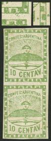 61 ARGENTINA - CONFEDERACIÓN Pareja / Nuevo con bisagra N°Cat.: GJ.2 MB. GJ.2, 10c Cifras Chicas, pareja, ambos con VARIEDADES, el superior : rayos en el margen inferior bajo el último eslabón, el inferior : punto de color en el margen derecho Precio inicial: US$ 10 Precio actual: US$ 10 Oferte US$ 10 o más