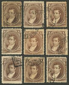 169 ARGENTINA - EMISIONES GENERALES Lote / Usado N°Cat.: GJ.36x9 Valor de catál.: 9,00 Buena GJ.36, 9 sellos con matasellos variados, buena a MB calidad general Precio inicial: US$ 6 Precio actual: US$ 6 Oferte US$ 6 o más