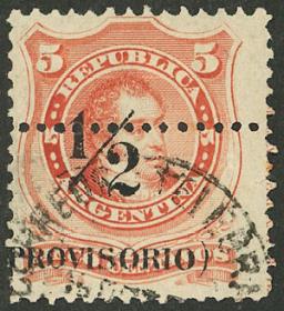 191 ARGENTINA - EMISIONES GENERALES Sello suelto / Usado N°Cat.: GJ.57 Valor de catál.: 15,00 Buena-MB GJ.57, con VARIEDAD : sin paréntesis del lado izquierdo ( por desplazamiento de la sobrecarga y ser el último sello de la fila ), escaso en usado Precio inicial: US$ 10 Precio actual: US$ 10 Oferte US$ 10 o más
