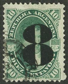 183 ARGENTINA - EMISIONES GENERALES Sello suelto / Usado N°Cat.: GJ.47 Valor de catál.: 30,00 MB. GJ.47, 8c sobre 10c Precio inicial: US$ 15 Precio actual: US$ 15 Oferte US$ 15 o más